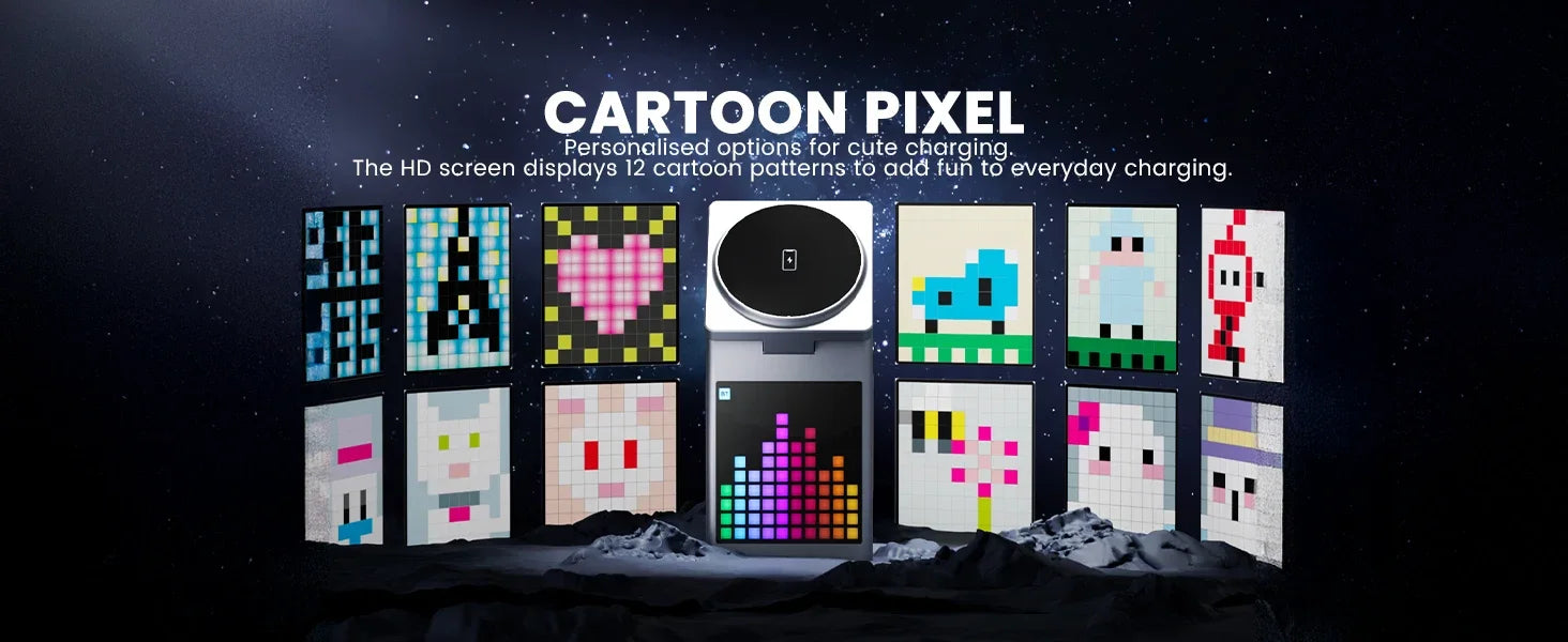 Ein vielseitiges Gerät, das kabelloses Laden, Bluetooth-Sound, Wecker, Nachtlicht und ein animiertes Pixel-Displayin einem kompakten Design vereint. Ideal für Schreibtisch, Schlafzimmer oder Reisen.