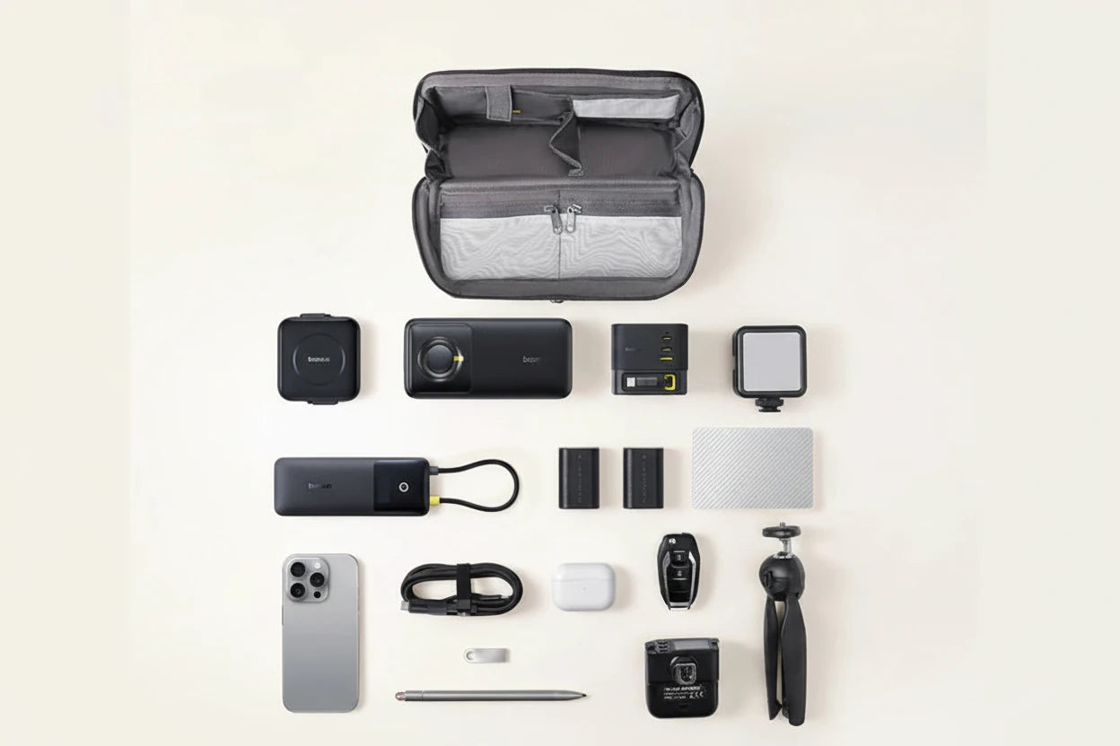 Kompakte, tragbare Tasche zum Schutz und zur Organisation von Powerbanks, Ladegeräten, Kabeln, Kopfhörern und Kameras.