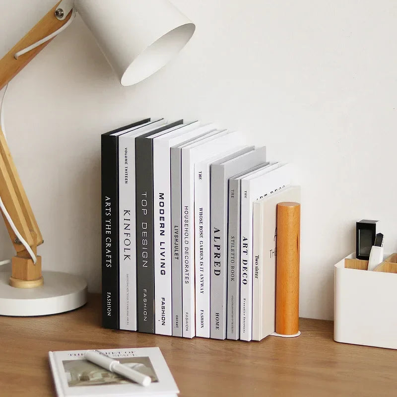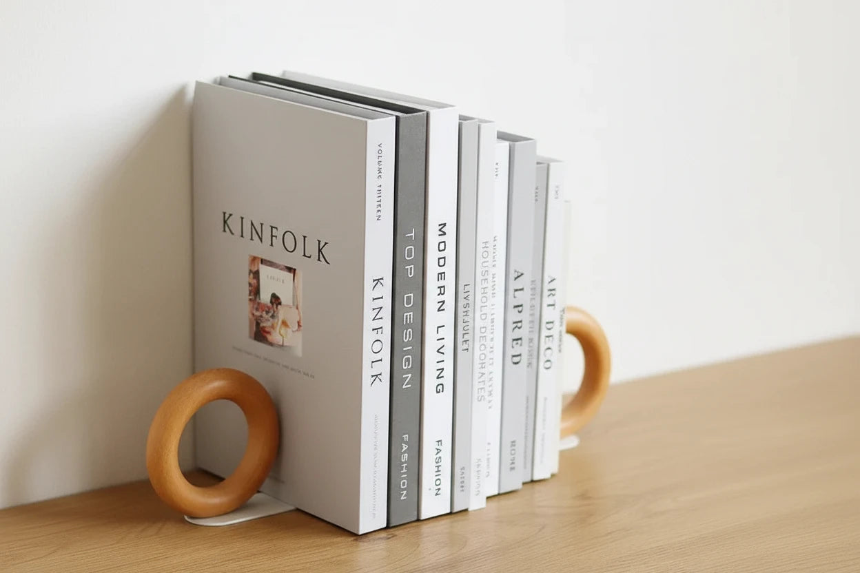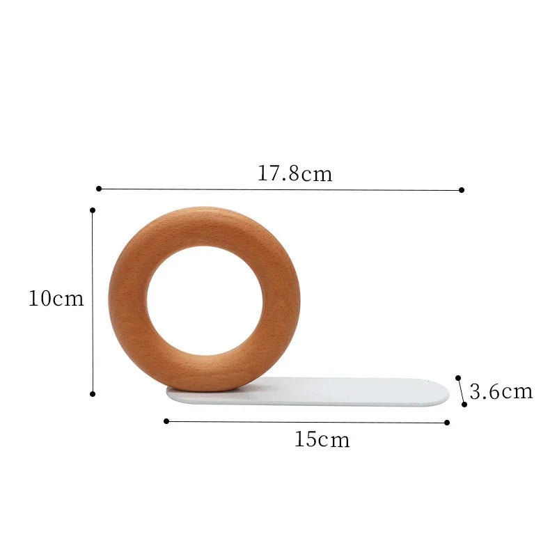 Dieser schlichte Holz-Desktop-Organizer kombiniert Funktionalität mit stilvollem, modernem Design. Mit seiner einzigartigen säulenförmigen Donut-Struktur dient er sowohl als dekorativer Blickfang als auch als stabile Buchstütze oder kleines Bücherregal für Büro und Zuhause.