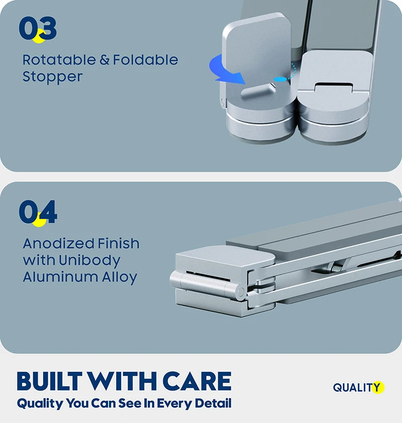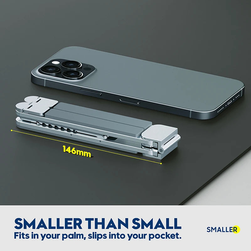 Die Aluminiumkonstruktion sorgt für festen Halt, während rutschfeste Pads das Gerät vor Kratzern schützen und ein Verrutschen verhindern.